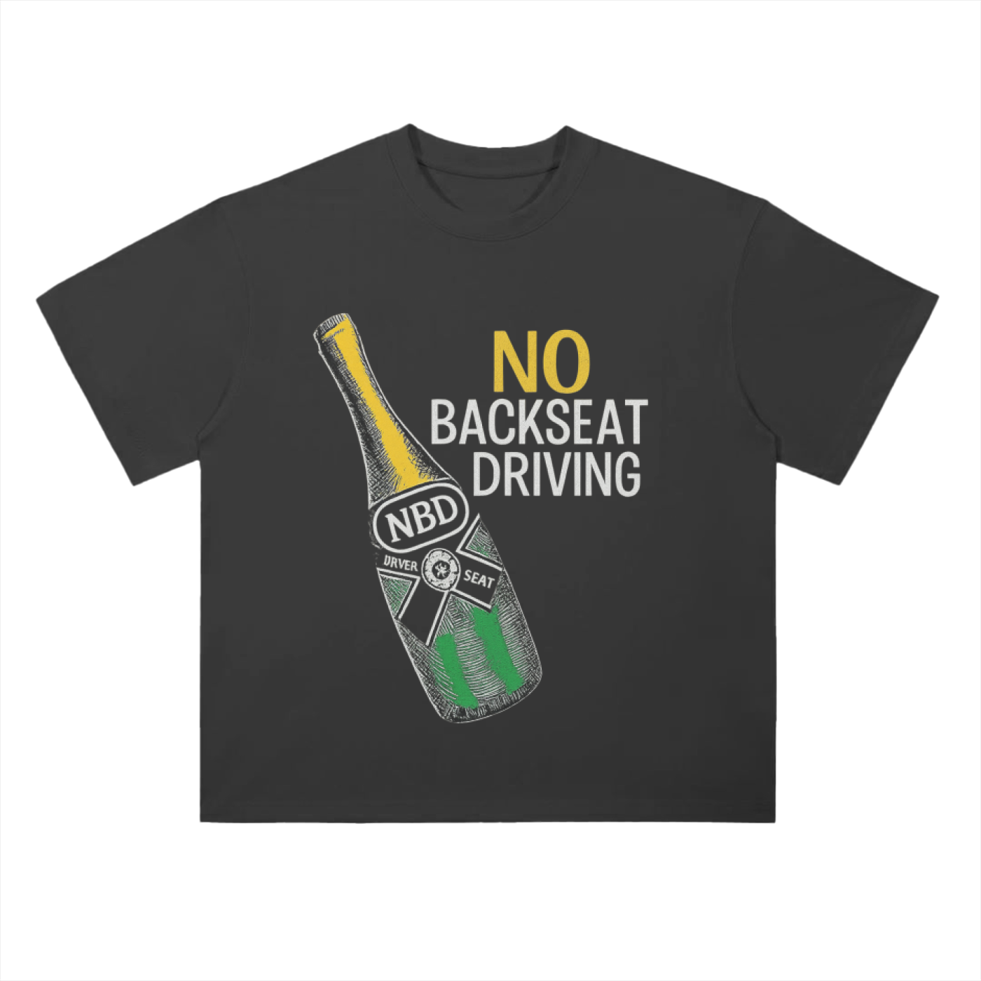 Pop bottles. Set the tone. The Bottle Poppin' Tee blends street flex with celebration energy, featuring a sketch-style champagne bottle labeled NBD Driver Seat and stamped with the signature motto: No Backseat Driving. Whether you're toasting a win or just living like one, this tee speaks success with swagger.