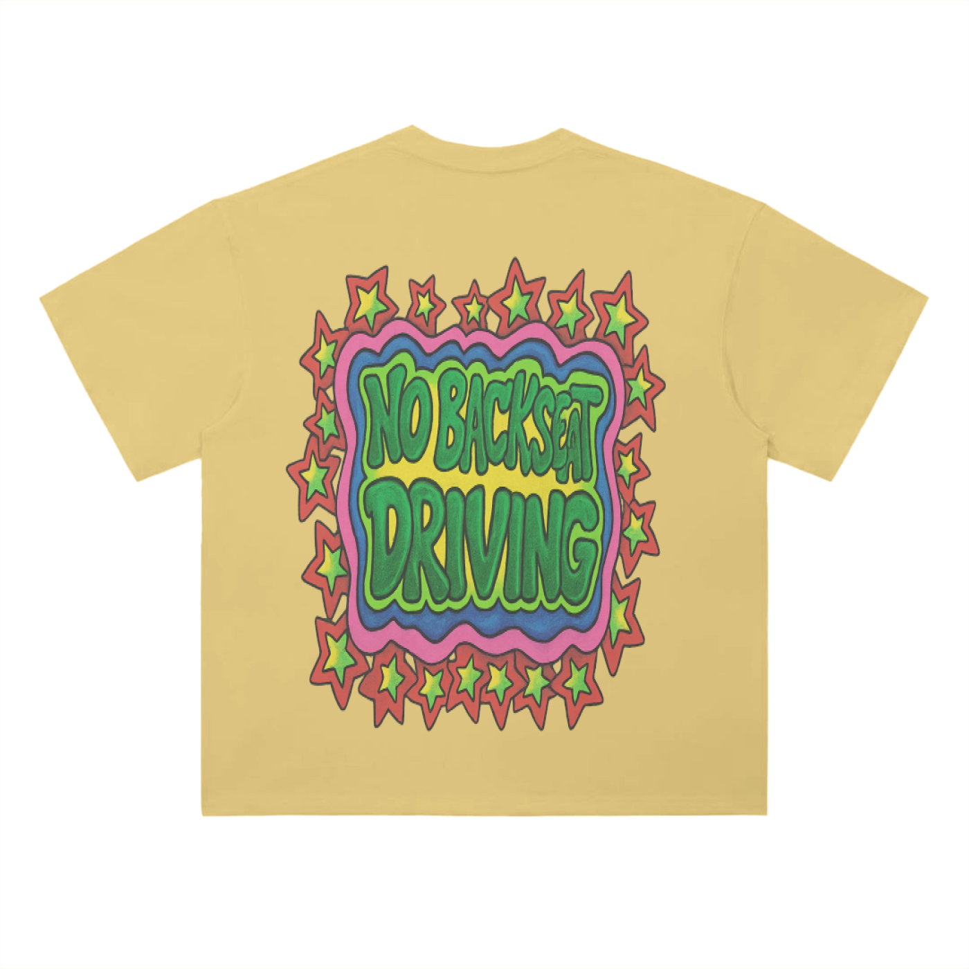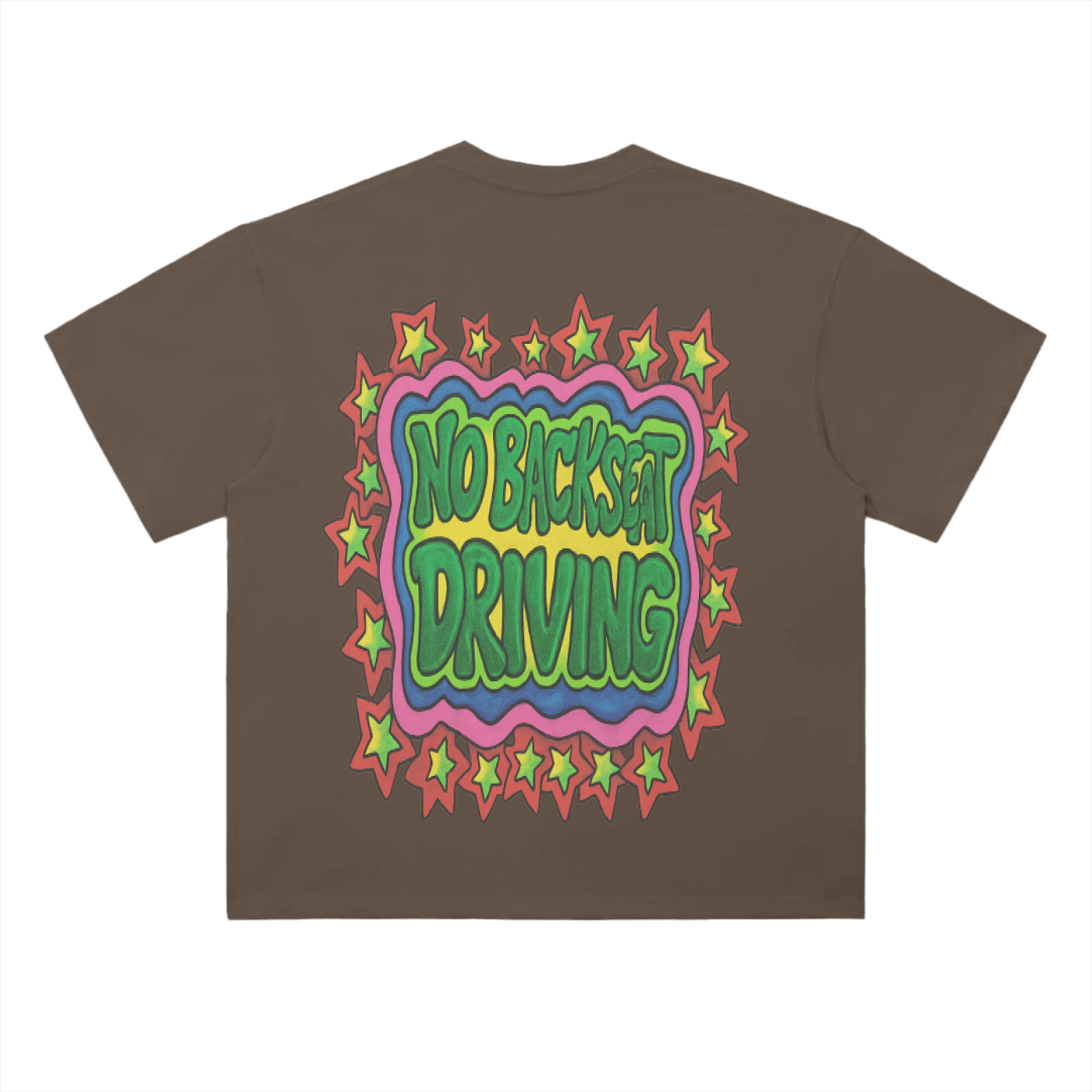 Trippy vibes. Loud message. The Far Out Tee is a bold, two-sided graphic piece bursting with color, character, and confidence. The front features a warped DRIVERSEAT logo surrounded by a cosmic frame of cartoon stars, while the back hits even harder with a wavy NO BACKSEAT DRIVING shout, wrapped in the same stellar border.